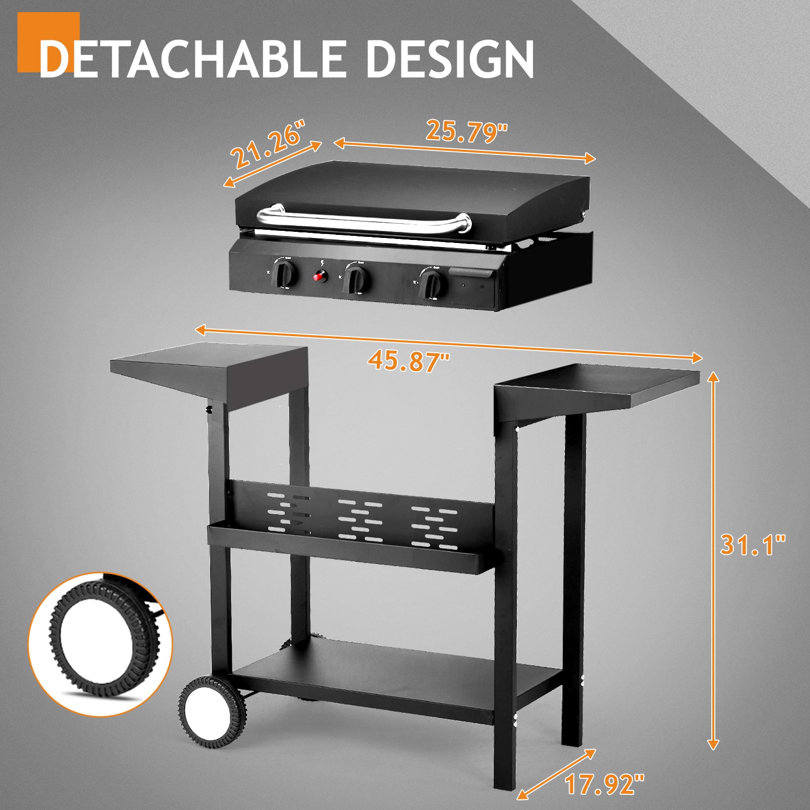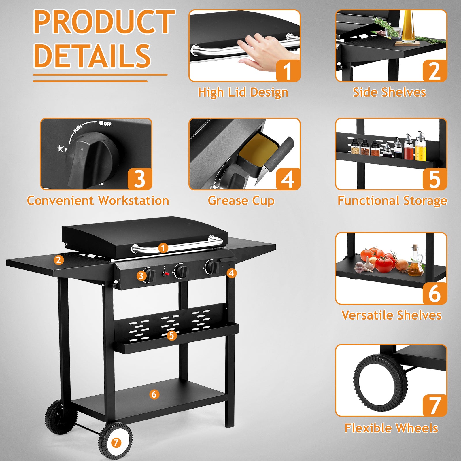 🔥 Key Features 1. Restaurant-Quality Flat Top Cooking Cook more, wait less. The large 23.2" x 14.2" flat top griddle provides ample space for everything from burgers and stir-fry to breakfast favorites — ideal for backyard BBQs, patios, tailgates, and camping trips. 2. Healthy Non-Stick Ceramic Coating The ceramic-coated cast iron surface promotes even heating and prevents sticking, allowing you to use less oil for healthier meals. Cleanup is a breeze — just wipe it clean after use. 3. Triple-Burner Precision Control Three independently controlled burners let you create multiple heat zones across the cooking surface. Sear meats on one side while keeping veggies warm on the other — perfect for versatile cooking and large gatherings. 4. Smart Storage & Prep Design Stay organized while you cook. A front spice rack keeps seasonings within reach, while dual side shelves and a bottom storage rack offer plenty of space for tools, plates, and ingredients. Everything you need, right where you need it. 5. Effortless Grease Management & Cleaning Spend less time scrubbing and more time enjoying. The griddle includes a built-in oil drip hole and slide-out grease cup for easy cleanup after every meal. Specifications Material: Iron, Stainless Steel, Plastic Overall Dimensions: 45.9 x 17.7 x 33.5 in / 116.5 x 45 x 85 cm Griddle Plate: 23.2 x 14.2 in / 59 x 36 cm Side Shelves: 11 x 13.6 in / 28 x 34.5 cm Bottom Shelf: 24 x 13.4 in / 61 x 34 cm Ground Clearance: 4.9 in / 12.5 cm Spice Rack: 24.4 x 3.5 in / 62 x 9 cm Package Includes 1 × 3-Burner Flat Top Gas Griddle Cooking Station