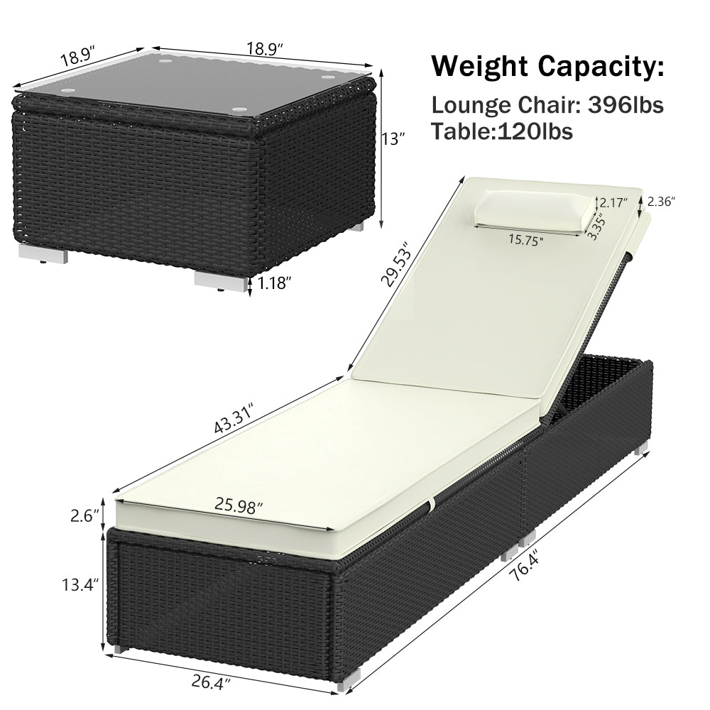 3 Piece Patio Chaise Lounge Chair Set, Rattan Chaise Lounges with Table, Sun Chaise Lounge Furniture Set with Removable Cushion, Tanning Lounge Chair with 6 Adjustable Positions for Pool Deck