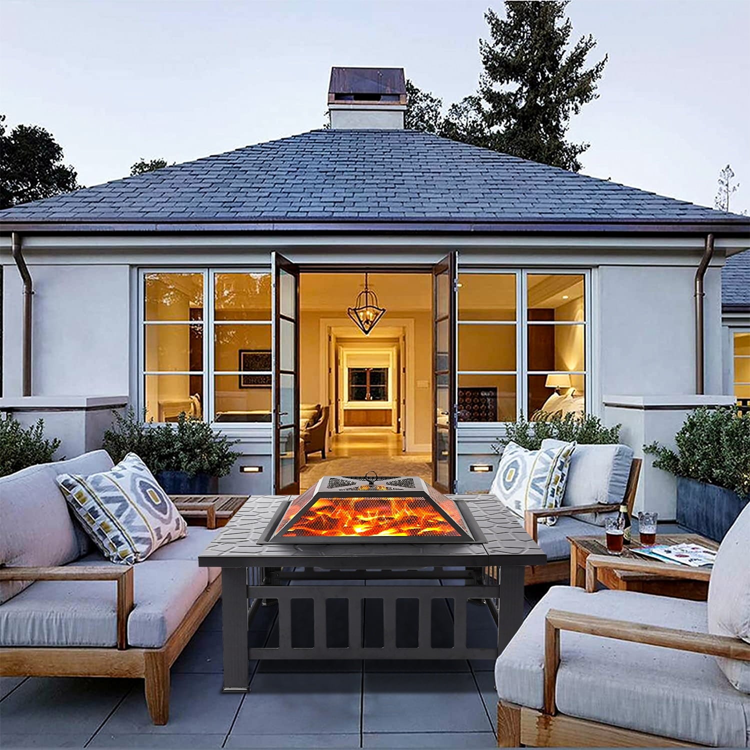 This premium fire pit is built in a square shape for stability. The 5.3'' wide edge around the fire bowl provides ample space for holding plates, sauces, brushes and other barbecue supplies, allowing convenient access during cooking.
