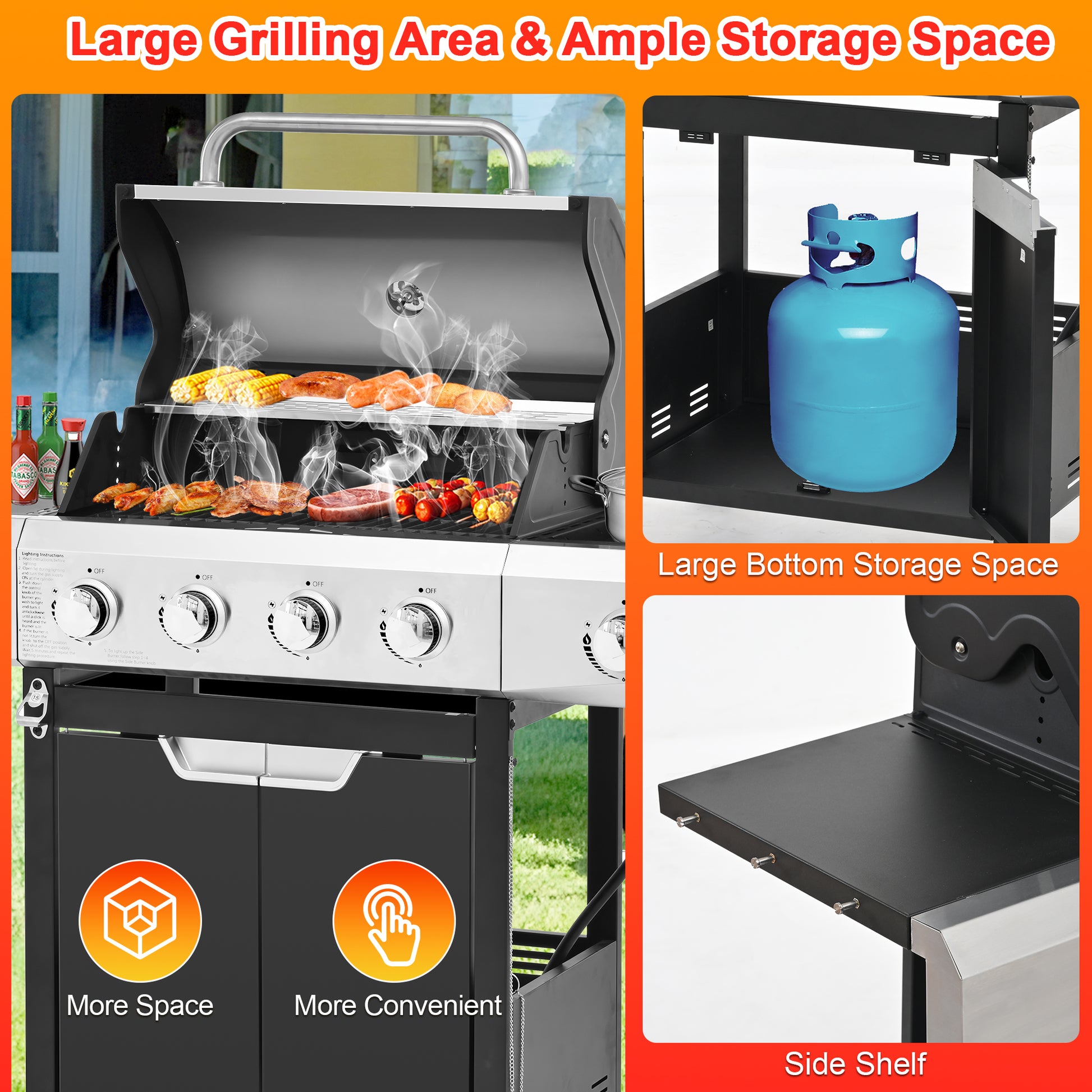 4-Burner Gas Grill with Side Burner, 51,000 BTU Propane BBQ Grill with Porcelain-Enameled Cast Iron Grates, Built-in Thermometer, Ideal for Patio Camping Outdoor Cooking
