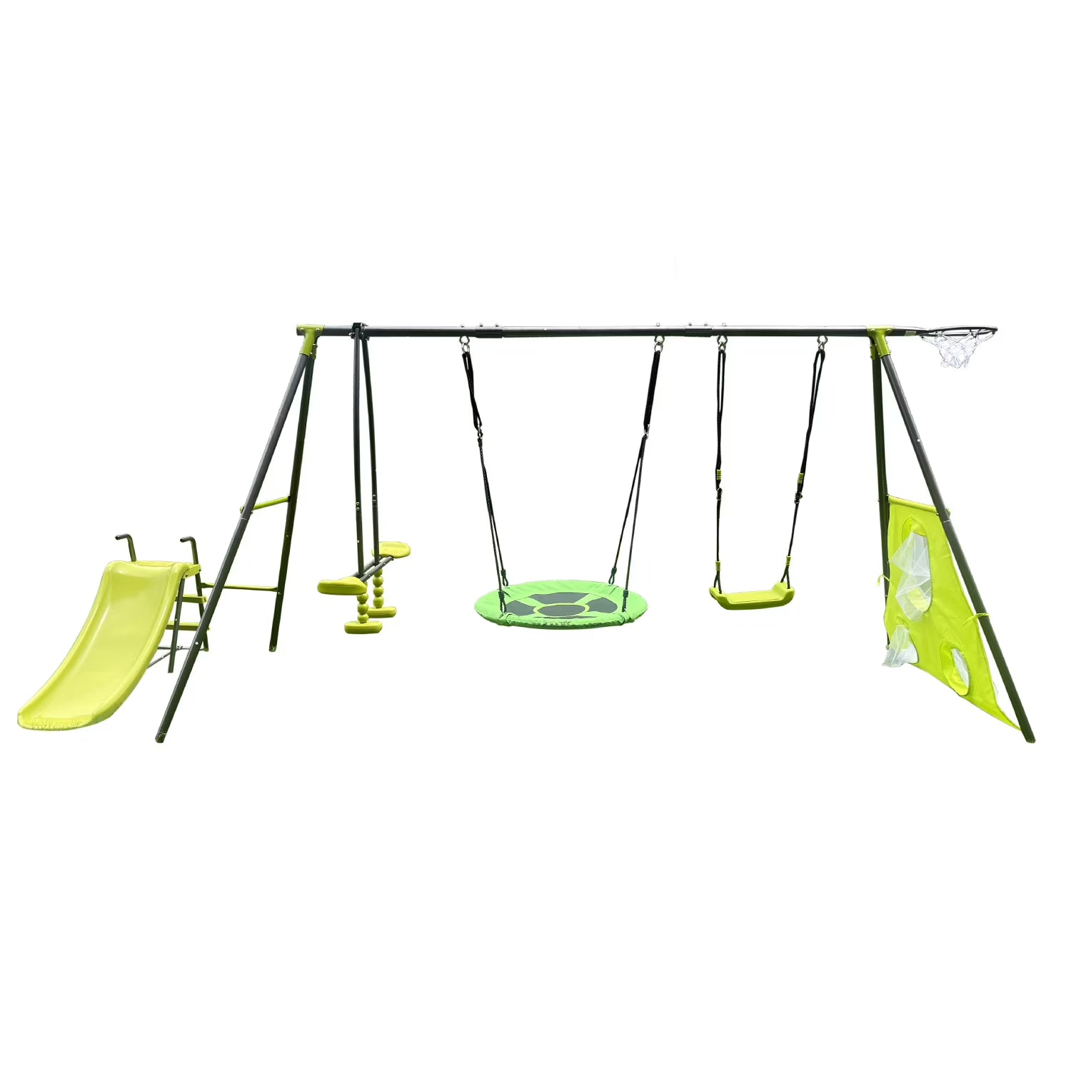 5 in 1 Outdoor Metal Swing Set with Seesaw Swing, Playground Swing Sets with Heavy-Duty A-Frame Metal Outdoor Stand, Swing n' Slide Playset for Kids with Basketball Hoop