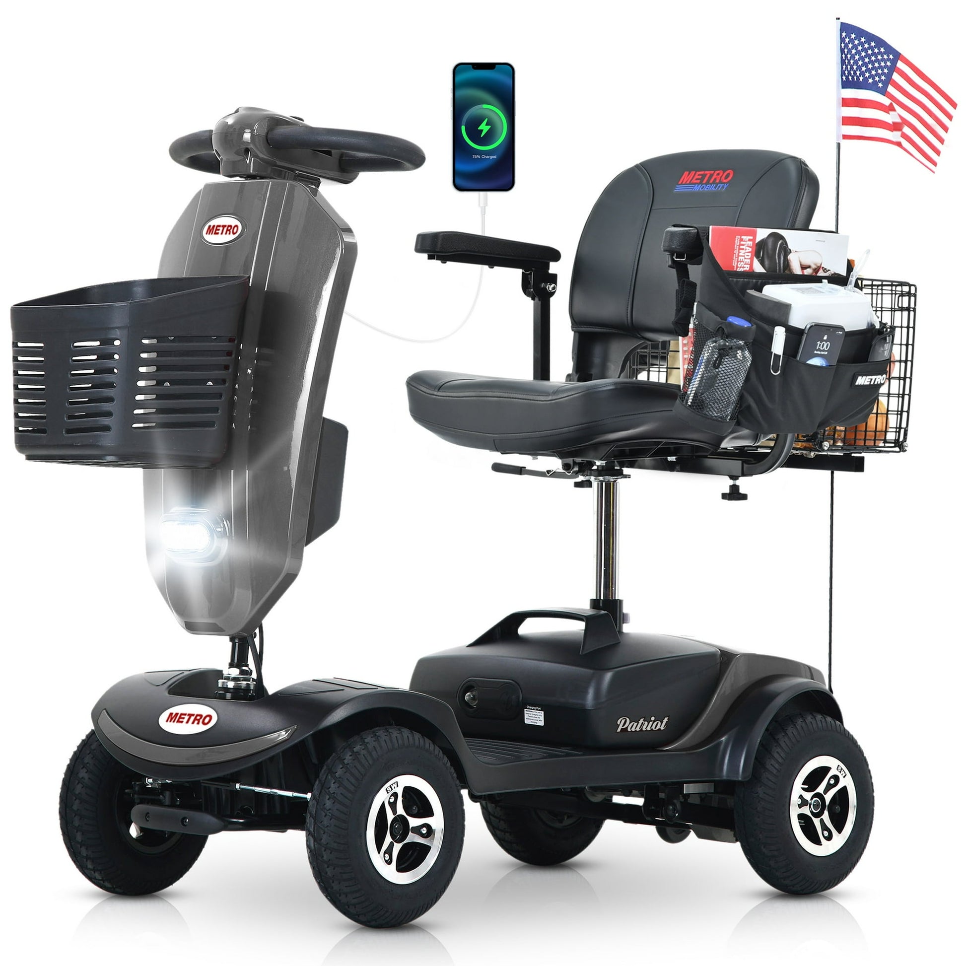The scooter can be easily disassembled into manageable parts for compact storage and transport in most vehicle trunks.