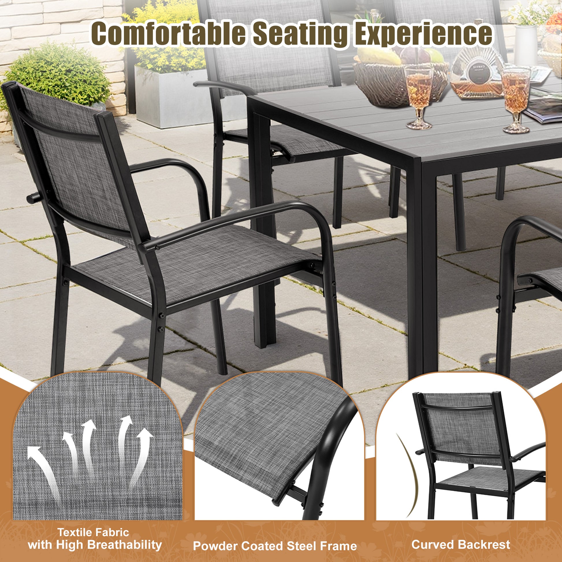 Our 7 Piece Outdoor Patio Dining Set combines breathable textilene and concise lines, which is an ideal choice for a group of friends to have a conversation or just relax! The table and chair are made of stable and durable steel frame, each chair can hold around 353 lbs and the coffee table can hold up to 265 lbs. There are enough chairs to provide enough sitting space for your family members. Coming with textilene material, you can enjoy a comfortable sitting experience and the cleaning will be convenient. The spacious dining table has a plastic wood tabletop for added delicacy. This patio dining set is stylish and you can combine all the pacts according to your different needs. Our outdoor dining set will be an eye-catching addition to your backyard, garden and courtyard.