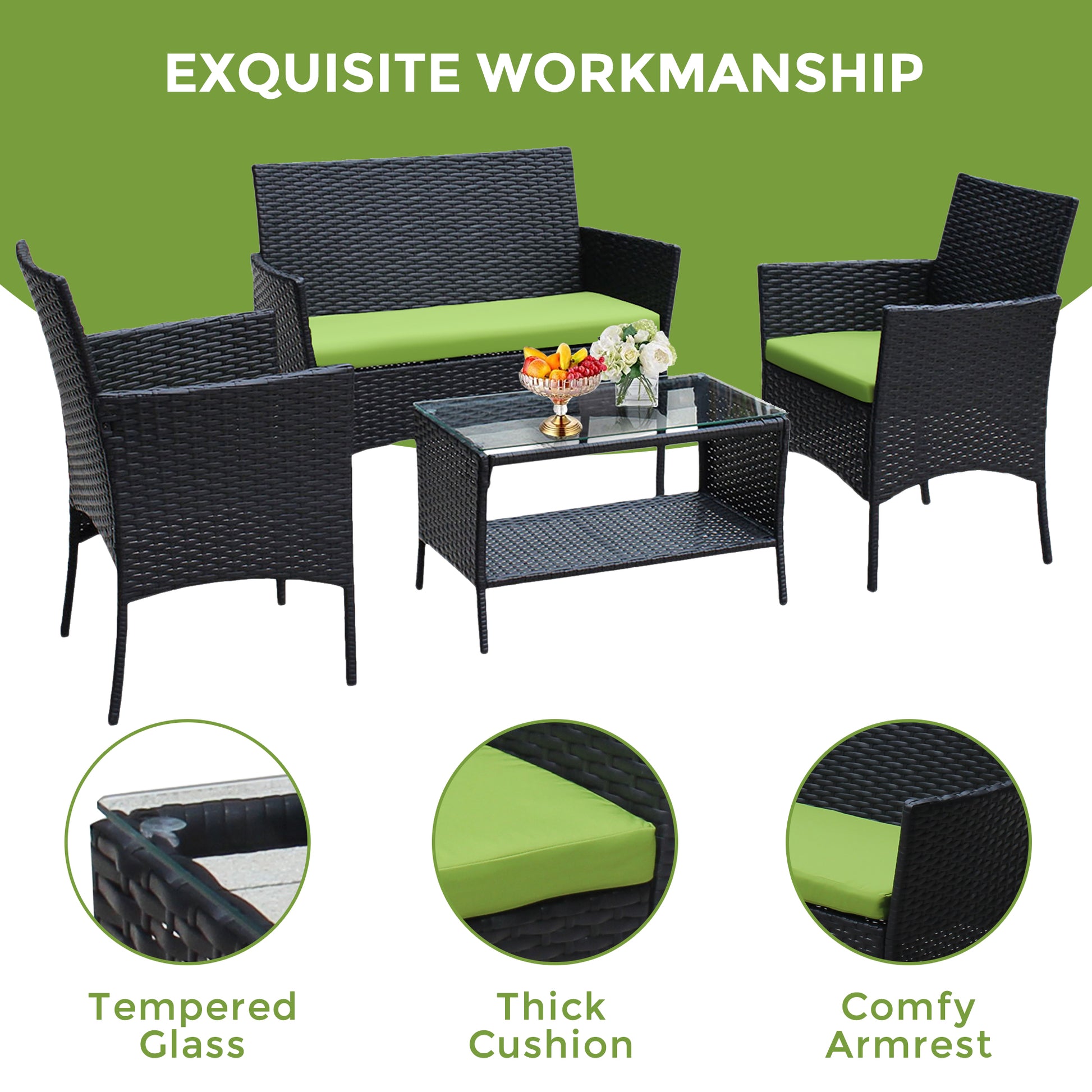 Patio Furniture Set, 4 Pieces Outdoor Rattan Conversation Sofa Set, All-Weather Wicker Patio Sets, Cushioned Sofa and Coffee Table for Garden Deck Courtyard, Green