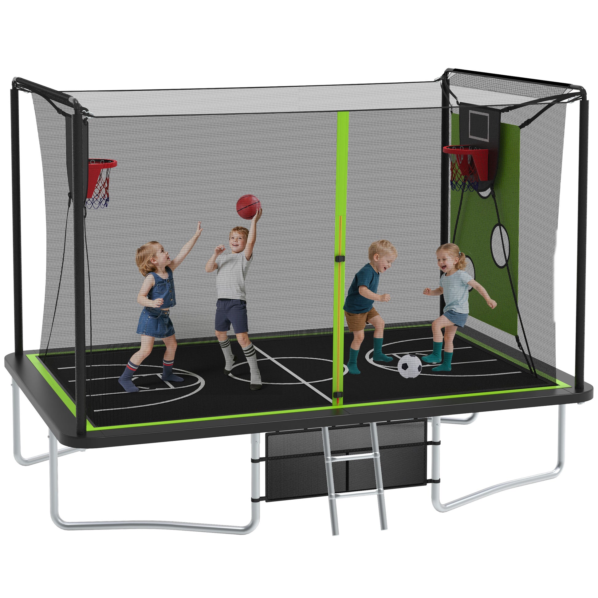 The SEGMART 8x12FT large rectangular trampoline provides fun with football, basketball, and jumping activities. Includes a basketball, soccer ball, two hoops, and a target net, perfect for fitness enthusiasts and family playtime in a 96 sqft space.
