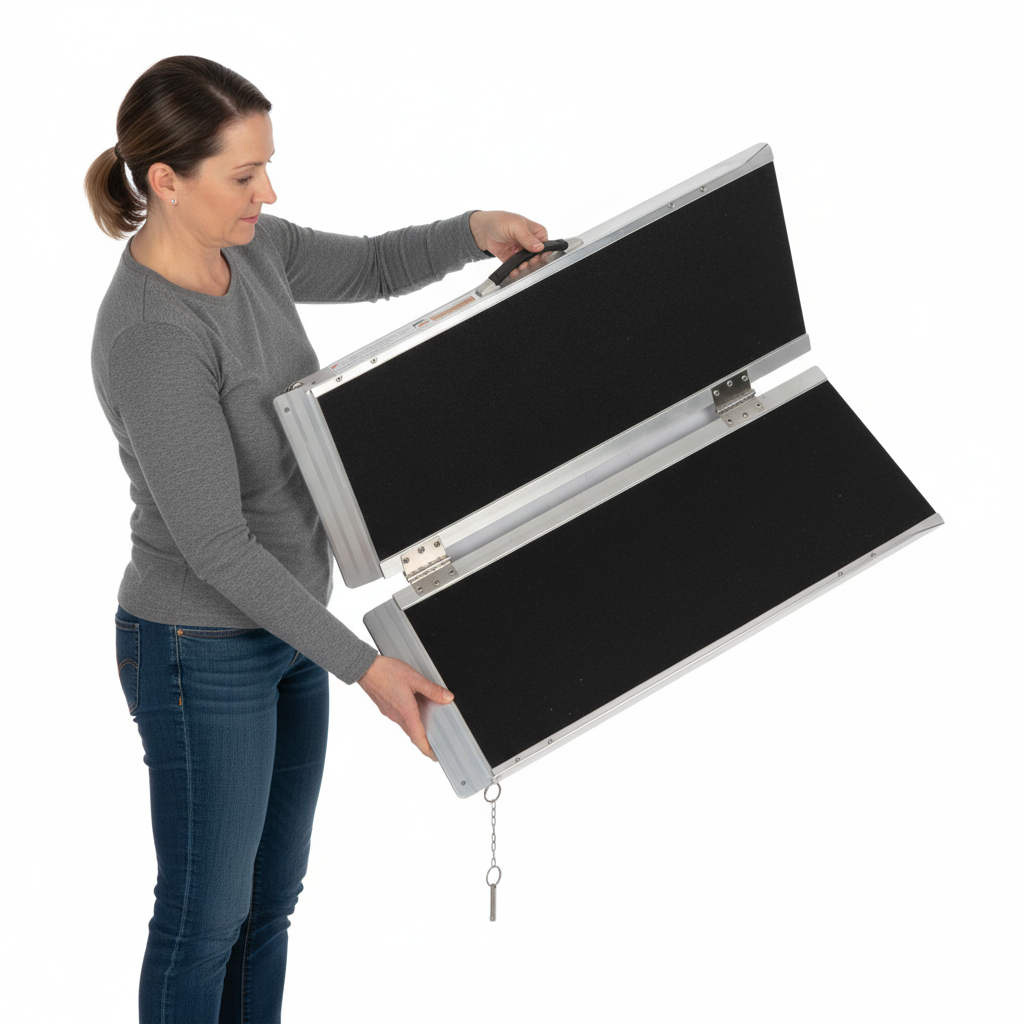 Easy installation makes our ramps portable your passport to newfound freedom. Easily maneuver your wheelchair or scooter up and down steps, low stairs, or into the garage—regain your independence!✨ **Compact Folds for Easy Portability** ✨