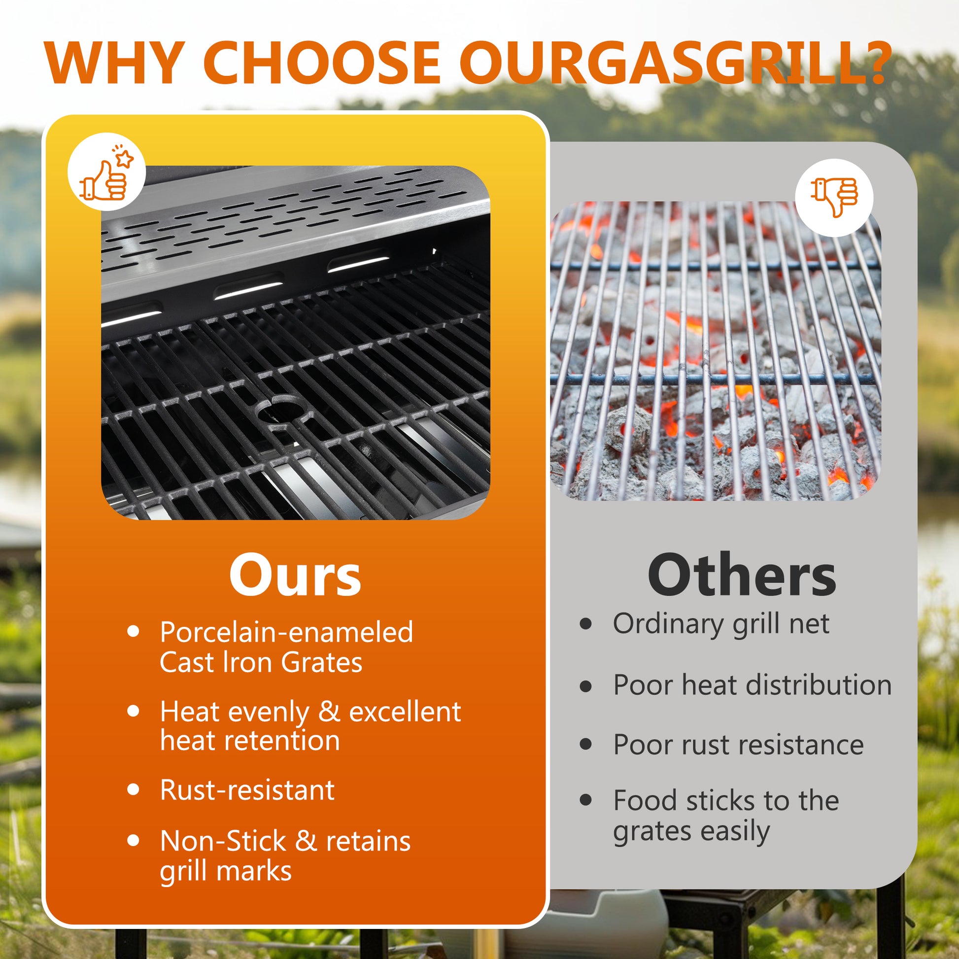 【Multi-functional & Convenient】This propane gas grill is perfect for outdoor spaces like patio, backyard, garden, courtyard and balcony for most families, alternative all seasons for outdoor cooking.