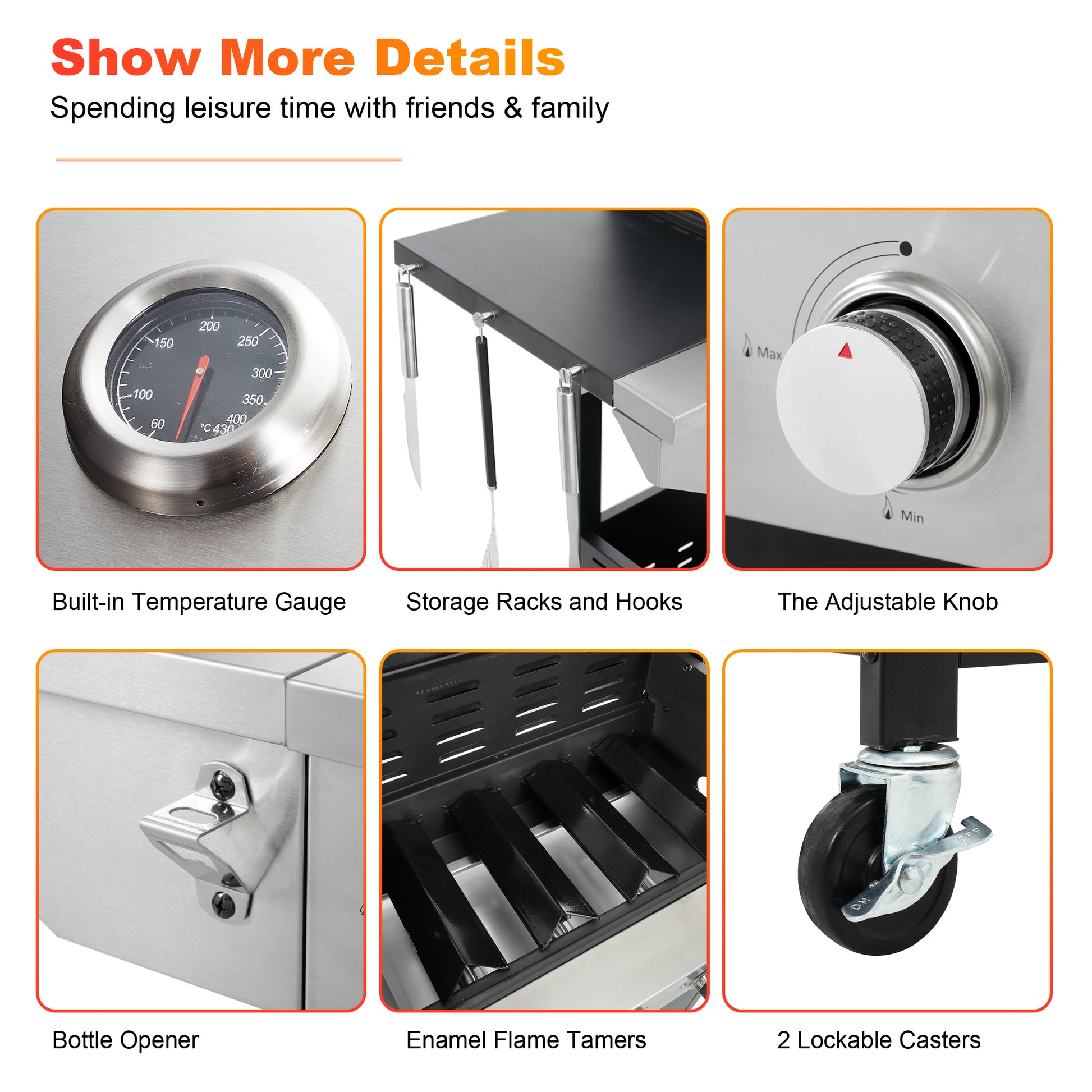 Stainless steel finish increased the durability and look; Built-in temperature gauge makes heat control easily; Lid can keep warm better when cooking food; The design of the side hook is more convenient for the operator to store kitchen tools; This outdoor grill is equipped with 4 wheels(two directional wheels, two steering wheels), making it easier to move.